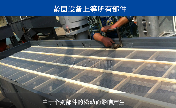 對(duì)重型振動(dòng)篩設(shè)備上的所有部件進(jìn)行排查,看看是否出現(xiàn)松動(dòng),并及時(shí)加以緊固,特別是需要經(jīng)常更換的篩板,避免由于個(gè)別部件的松動(dòng)而產(chǎn)生的額外振動(dòng)。