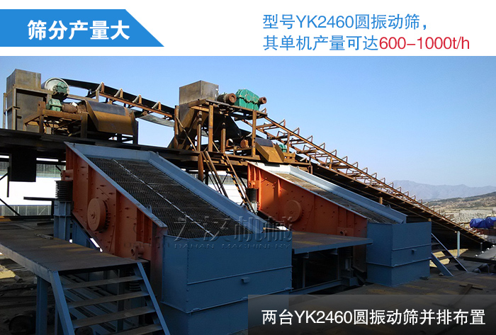 型號(hào)YK2460圓振動(dòng)篩,其單機(jī)產(chǎn)量可達(dá)600-1000t/h,在時(shí)產(chǎn)2000噸的鐵礦石生產(chǎn)線中,兩臺(tái)YK2460圓振動(dòng)篩并排布置,便可輕松達(dá)到生產(chǎn)線篩分產(chǎn)量要求,篩分產(chǎn)量是非常可觀的。